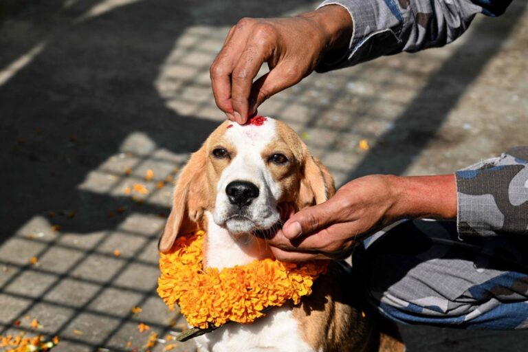Les habitants de Katmandou célèbrent le Kukur Tihar, dans le cadre de la deuxième journée du festival Tihar, une journée...