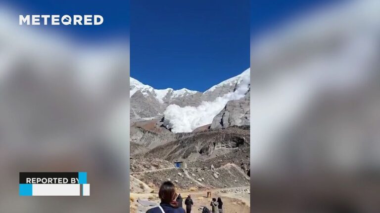 L'énorme masse de neige, de glace et de roches a dévalé l'un des versants, générant un grand nuage blanc visible...